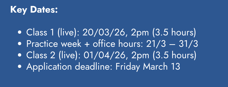 Format: 2 live classes (3.5 hours each) + 1 practice week (async) with coaching