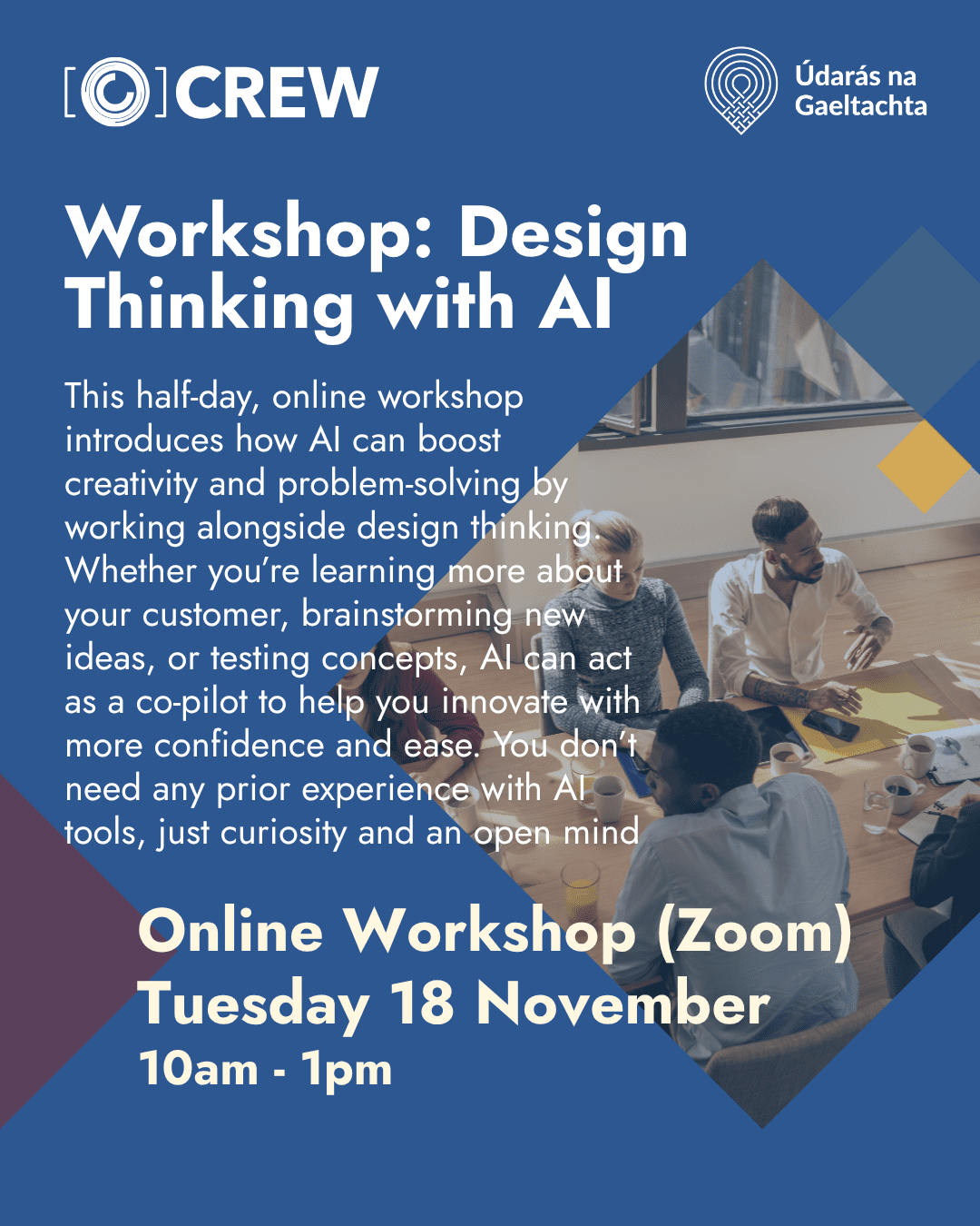 Cuireann an ceardlann praiticiúil leath-lae seo eolas ar fáil faoi conas is féidir le Gníomhaíocht Intleachta Shaorga cruthaitheacht agus réiteach fadhbanna a chur chun cinn trí obair i gcomhthéacs smaointeoireachta dearadh.