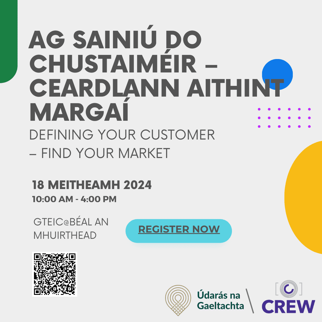 In this second workshop series, as part of our CREW x Udaras na Gaeltachta partner programme, participants will explore the market research process. Explore tools for understanding and defining your customer, and gain insights into market segments. Each participant will learn the tools and processes required for ongoing customer discovery, building a customer profile, competitiors analysis, and market analysis to ensure a strong start for their business.