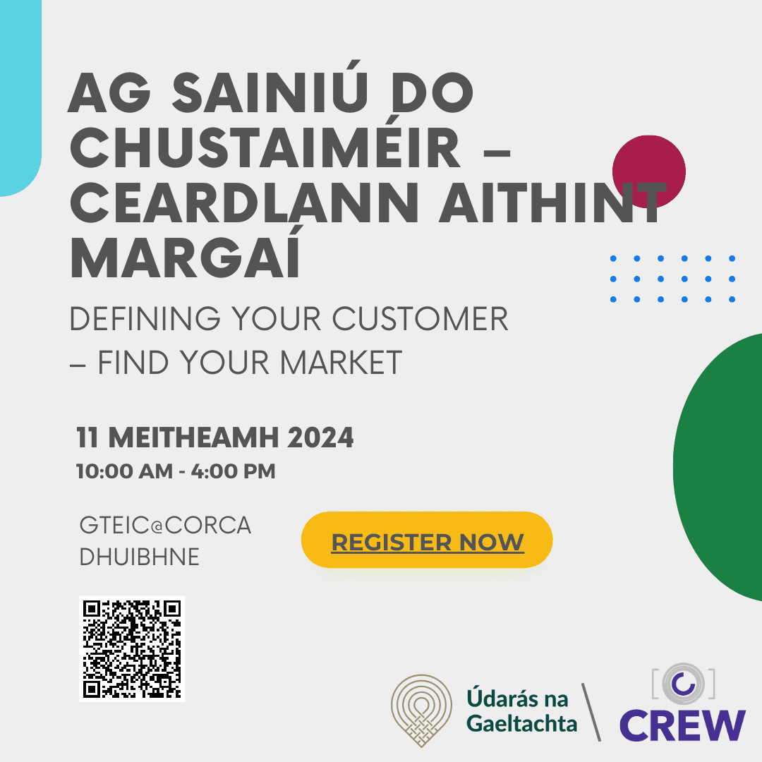 In this second workshop series, as part of our CREW x Udaras na Gaeltachta partner programme, participants will explore the market research process.  Explore tools for understanding and defining your customer, and gain insights into market segments.  Each participant will learn the tools and processes required for ongoing customer discovery, building a customer profile, competitiors analysis, and market analysis to ensure a strong start for their business.