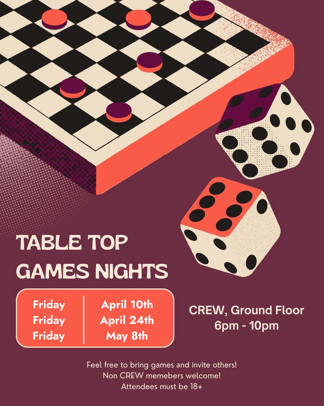 If you are looking for a fun, relaxing event to meet new people and play an array of boardgames then come to CREW for what promises to be an evening full of laughter, and great memories.